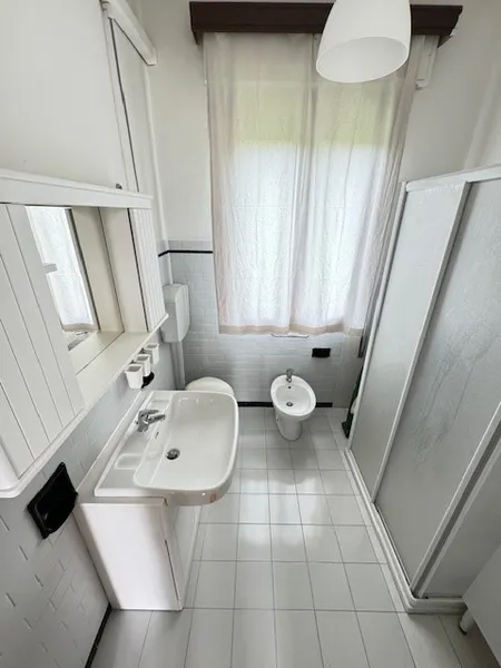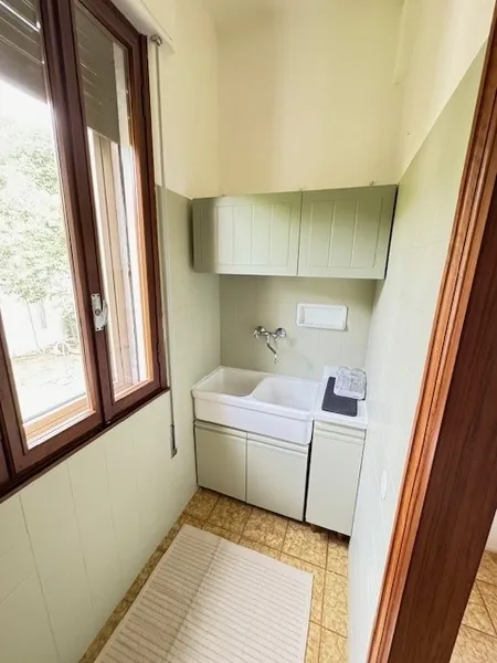 Le parti comuni sono: ingresso ampio con ripostiglio, soggiorno con angolo cottura, un bagno finestrato, cantina con spazio lavanderia, garage per moto e bici, posti auto interni scoperti, e giardino privato.